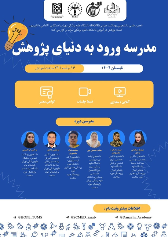 انجمن علمی دانشجویی بهداشت عمومی HOPE دانشگاه علوم پزشکی تهران به همراه آکادمی داناوین و کمیته پژوهش در آموزش دانشکده علوم پزشکی سراب برگزار می کند: