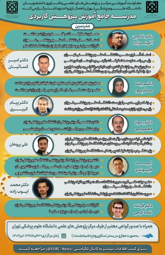 معاونت آموزشی مرکز پژوهش‌های علمی و فناوری دانشجویان دانشگاه علوم پزشکی تهران با همکاری واحد بهداشت، مدرسه جامع آموزش پژوهش کاربردی را با حضور اساتید برتر برگزار می کند.
