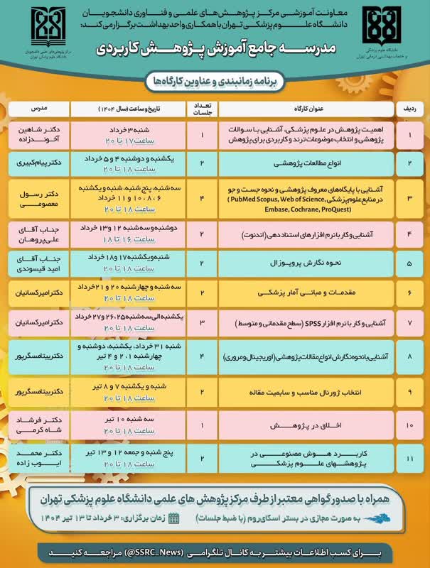 این مدرسه بزرگ پژوهشی در  ۱۱ عنوان کارگاه و ۲۵ جلسه (۵۱ ساعت آموزش کامل و کاربردی پژوهش)  به صورت آنلاین در بستر اسکای‌روم از  ۳ خرداد لغایت ۱۳ تیر ۱۴۰۴ برگزار می شود.