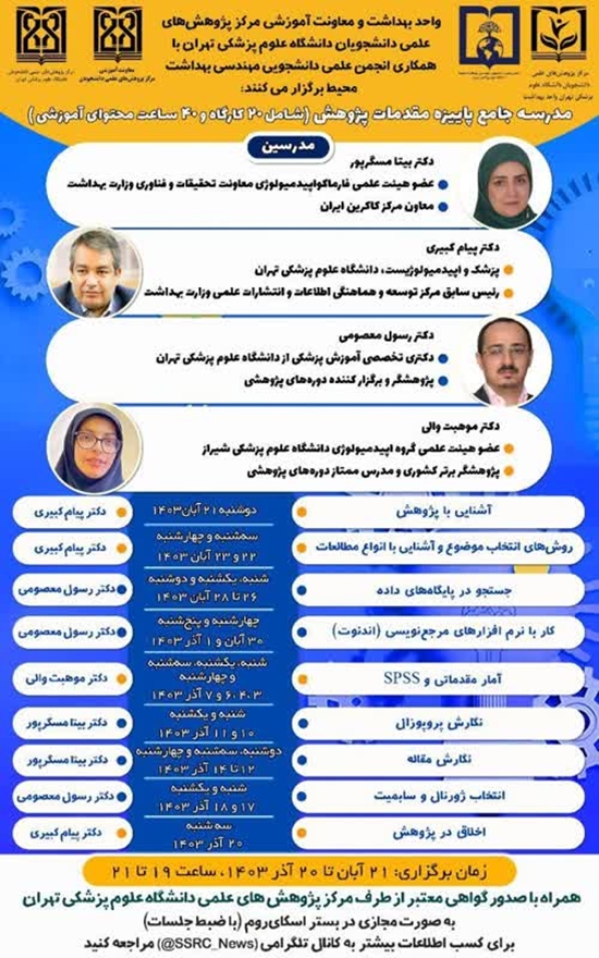 واحد بهداشت و معاونت آموزشی مرکز پژوهش های علمی دانشجویان با همکاری انجمن مهندسی بهداشت محیط، مدرسه جامع پاییزه مقدمات پژوهش را برای علاقمندان برگزار می نماید.