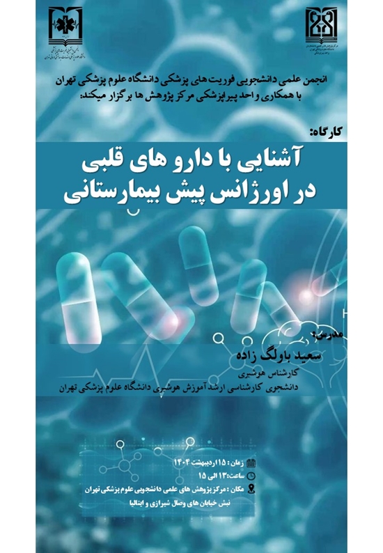 انجمن علمی دانشجویی فوریت‌های پزشکی دانشگاه علوم پزشکی تهران با همکاری واحد بیهوشی مرکز پژوهش‌های علمی دانشجویان، کارگاه تخصصی «آشنایی با داروهای قلبی در اورژانس پیش‌بیمارستانی» را برگزار می‌کند.