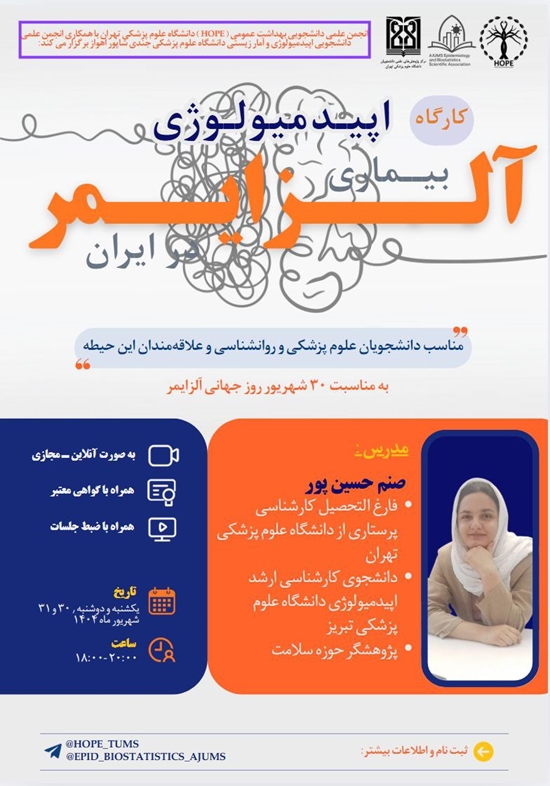 به مناسبت ۳۰ شهریور، روز جهانی آلزایمر، انجمن علمی دانشجویی بهداشت عمومی (HOPE) دانشگاه علوم پزشکی تهران با همکاری انجمن علمی دانشجویی اپیدمیولوژی و آمار زیستی و مرکز پژوهشهای علمی دانشجویان، کارگاه تخصصی اپیدمیولوژی بیماری آلزایمر در ایران را برگزار میکند.