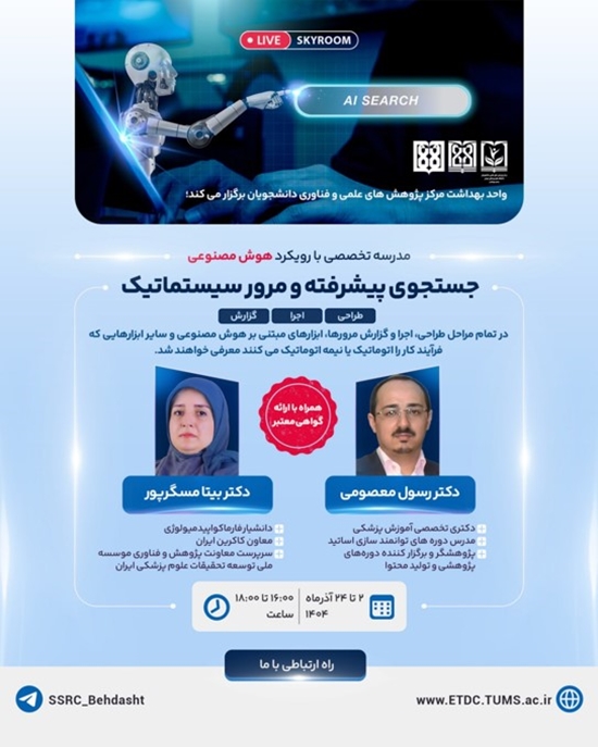 واحد بهداشت مرکز پژوهش‌های علمی و فناوری دانشجویان دانشگاه علوم پزشکی تهران، مدرسه تخصصی «جستجوی پیشرفته و مرور سیستماتیک با رویکرد هوش مصنوعی» را برگزار می‌کند.