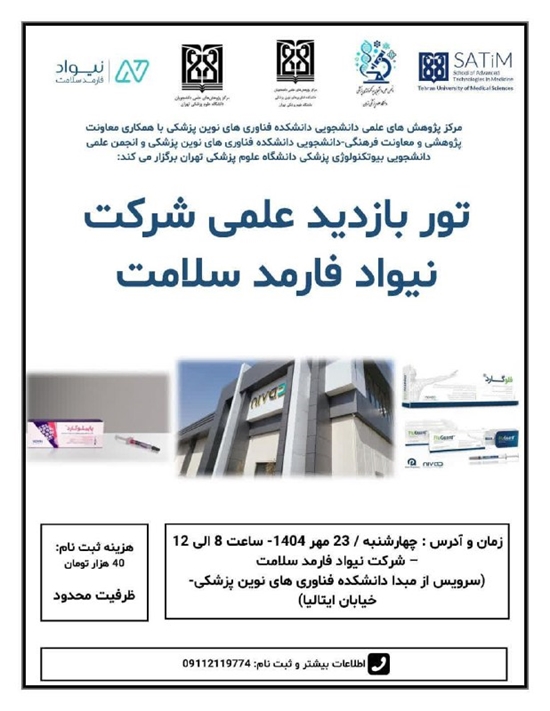 مکان: تهران-گرمدره- شرکت نیواد فارمد (حرکت سرویس راس ساعت ۸ صبح از مبدا خیابان ایتالیا - دانشکده فناوری های نوین پزشکی دانشگاه علوم پزشکی تهران)