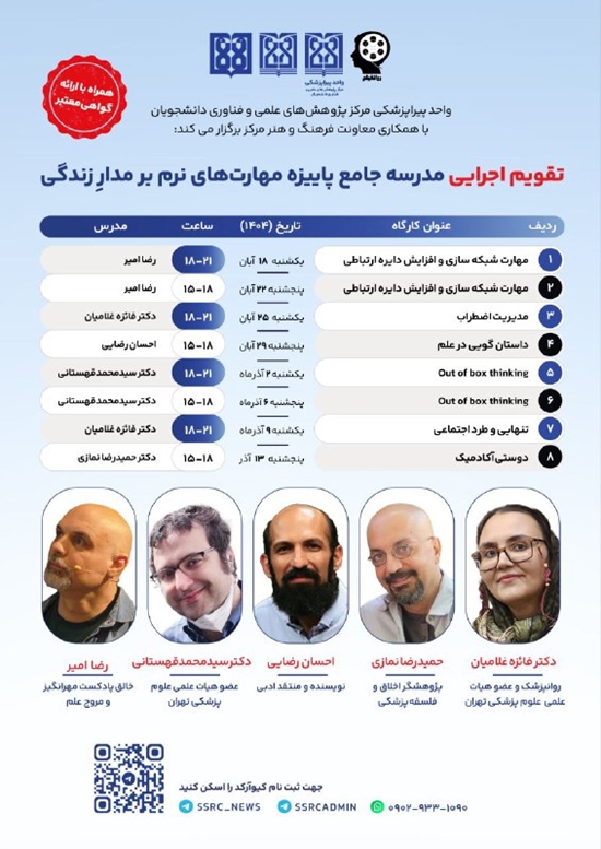 واحد پیراپزشکی مرکز پژوهشهای علمی و فناوری دانشجویان با همکاری معاونت فرهنگ و هنر مرکز و نشریه روانفیلم، مدرسه جامع پاییزه مهارتهای نرم را با عنوان بر مدارِ زندگی برگزار میکند.