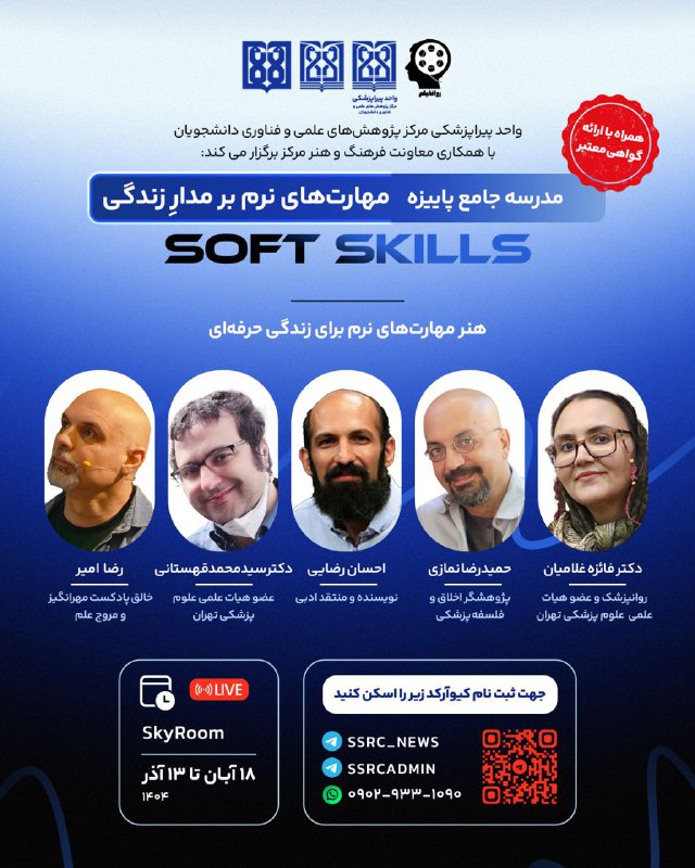 به گزارش روابط عمومی دانشگاه علوم پزشکی تهران مرکز پژوهش های علمی دانشجویان، واحد پیراپزشکی مرکز پژوهشهای علمی و فناوری دانشجویان با همکاری معاونت فرهنگ و هنر مرکز و نشریه روانفیلم، مدرسه جامع پاییزه مهارتهای نرم؛ بر مدارِ زندگی را برگزار میکند.